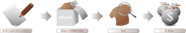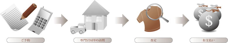 お売りになりたいブランド品が多く、発送の準備が大変だという時は直接お取引に伺います。事前にご予約が必要となりますので、お気軽にお問い合わせください。また、郵送の場合は買取キット(伝票・段ボール)をお送りしますのでお申し付け下さい。 |